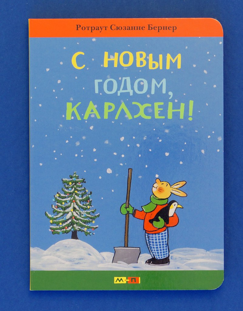 Для тех, кто уже полюбил этого зайчонка и собирает все рассказы о нем, приятный сюрприз — новенькая книга на картоне «С Новым годом, Карлхен!». Ее можно и к новогодним праздникам припрятать, и просто так почитать, без всякого повода. Карлхен в этой истории так сильно мне напомнил моих собственных «зайчат», которые так сильно ждут Новый год, что к 31-му декабря теряют покой, сон и аппетит: скорее бы настало утро, бежать под елочку разворачивать подарки. А будут ли подарки, точно Дед Мороз зайдет? Вот и зайчонок волновался, но при этом зря время не терял, он решил облегчить жизнь Деду Морозу и указать путь к своему дому.